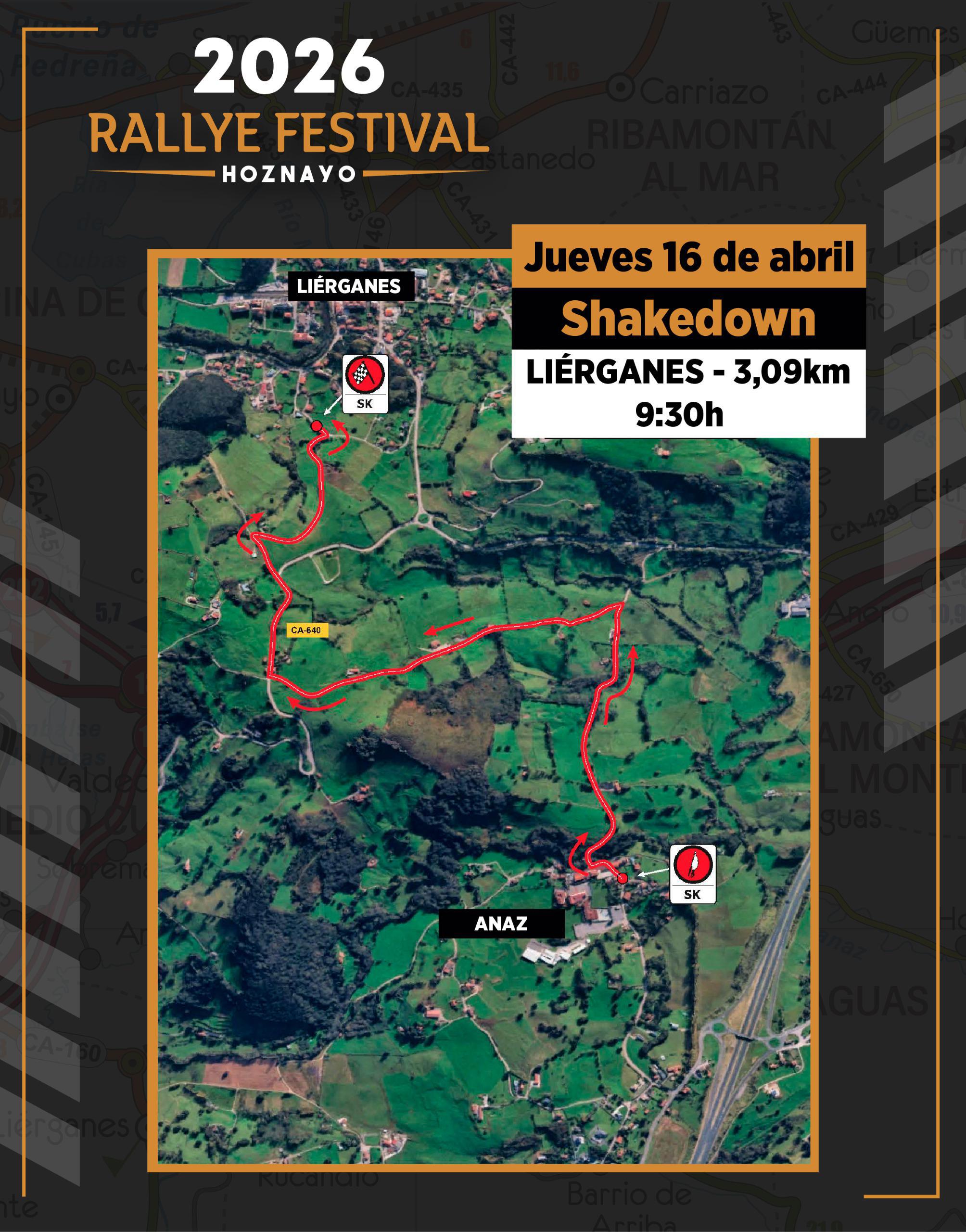 El Rallye Festival Hoznayo 2026 arrancará el jueves 16 de abril con la celebración del Shakedown “Liérganes”, un tramo de 3,09 km que comenzará a las 9:30 h y que servirá como primera toma de contacto para equipos y pilotos antes del inicio oficial de la competición. La salida estará situada en el pueblo de Anaz, cerca de Solares, para transitar por estrechas carreteras locales hasta la zona del alto del tramo de Hermosa, compartiendo con este el último kilómetro y medio del recorrido.
